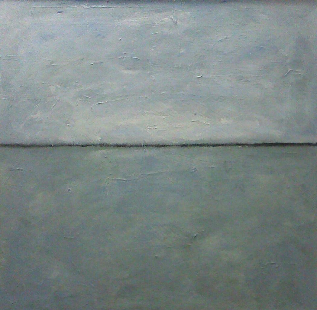 De zee verandert voortdurend van stemming. Nu is het grijs, met - als je goed kijkt - wat blauw erdoor. Als je je concentreert op het blauw, wordt het vanzelf een helder beeld. Dit werk heeft een smalle, witte baklijst. 64 x 64 cm. VERKOCHT.