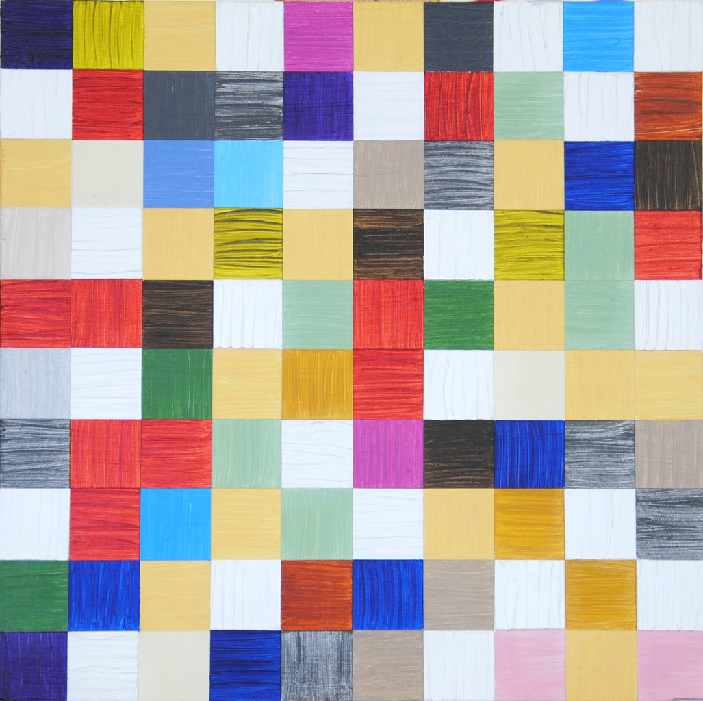 Thema: Chaos (Geometrische Chaos) Mijn kunst is beïnvloedt door de moderne wiskundige en wetenschappelijke benadering van het begrip complexe orde van de natuur. Met name heb ik me verdiept in de Chaos theorie en de fractal geometrie. Ik ben geen wiskundige, en ik gebruik geen wiskundige formules. De ideeën van de Chaos theorie en fractal geometrie leiden tot de ontwikkeling van de composities in mijn werk. Ik gebruik driehoeken,vierkanten en cirkels in mijn schilderijen, maar in mijn huidige serie, geoChao richt ik me alleen op de vierkanten en de verhoudingen tussen de vierkanten. Ik ontwikkel mijn composities door kleine vierkantjes op grote te zetten of grote op kleine te zetten. Het gaat om de onderlinge verhoudingen tussen de vierkanten. Ik laat de methode die ik kies de compositi