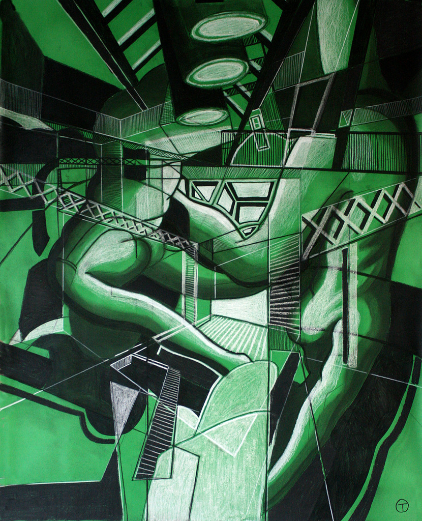 Drawing is a discipline in which ‘looking outside’ and ‘looking and moving within the frame of the paper’ is very important. Sources of inspiration are urban and industrial landscapes and shapes of the human body. Tom’s work consists of countless shades of black but he also uses colour in an exciting way. The artworks change as the daylight changes. Observations and impressions from spending time outdoors inspire his artwork. His skilled drawings may develop into new drawings as well as paintings. In his paintings he combines colour, patches and blots with lines to create several spaces.
