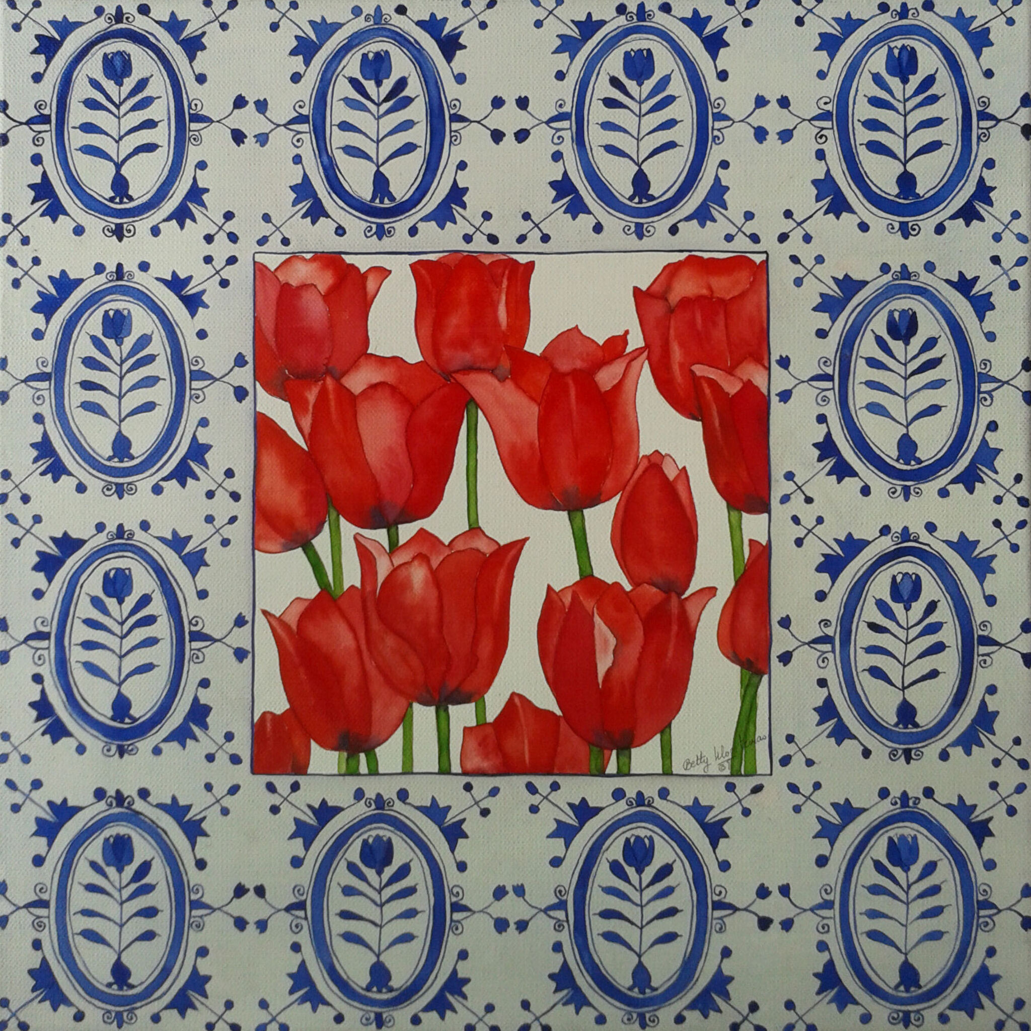 Geinspireerd op een delftsblauw tegelpatroon uit 1700. Rode tulpjes met een delftsblauwe tegelrand. Aquarel door een speciale techniek op doek geschilderd.