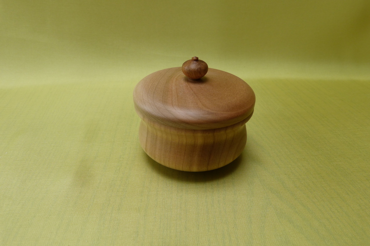 Een doosje van drie soorten hout: het doosje, de deksel en het knopje zijn alledrie uit verschillend hout gedraaid.