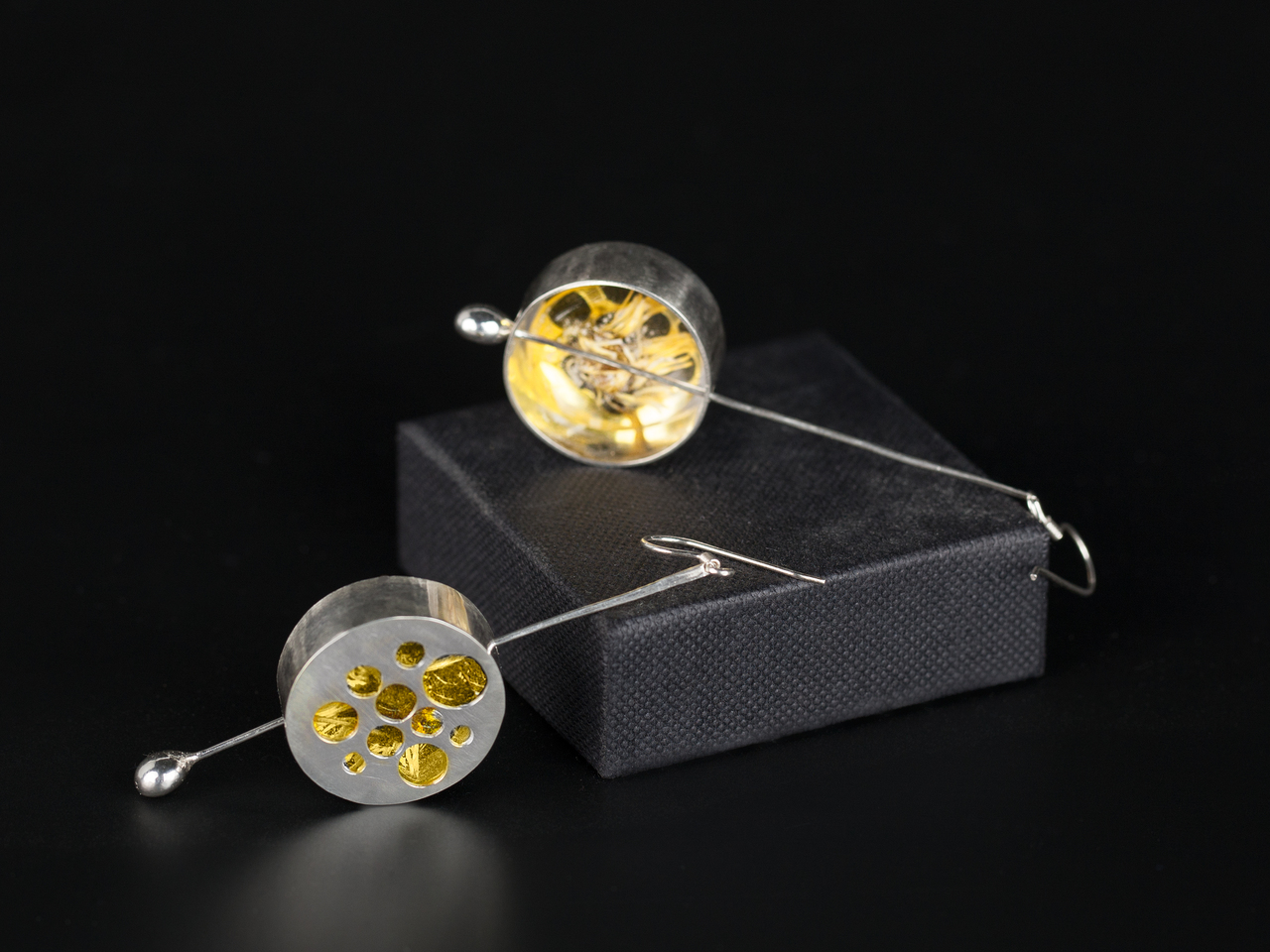 Oorbellen van zilver (925) met een los geel polyesterharsplaatje met gedroogde madeliefjes ingegoten