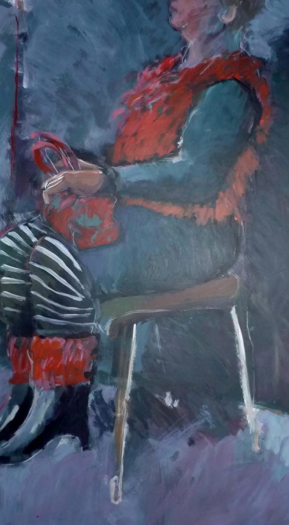 een model schilderij van een vrouw met een tasje op haar schoot ,zo,n typische houding.Ik heb expres niet het hele hoofd erop gezet.