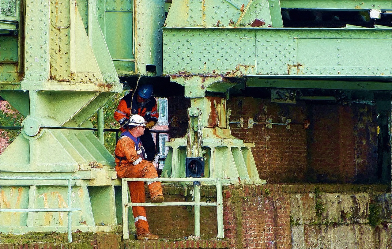 Opzichter met werker op de Hefbrug in Rotterdam tijdens het verwijderen van de val voor groot onderhoud
