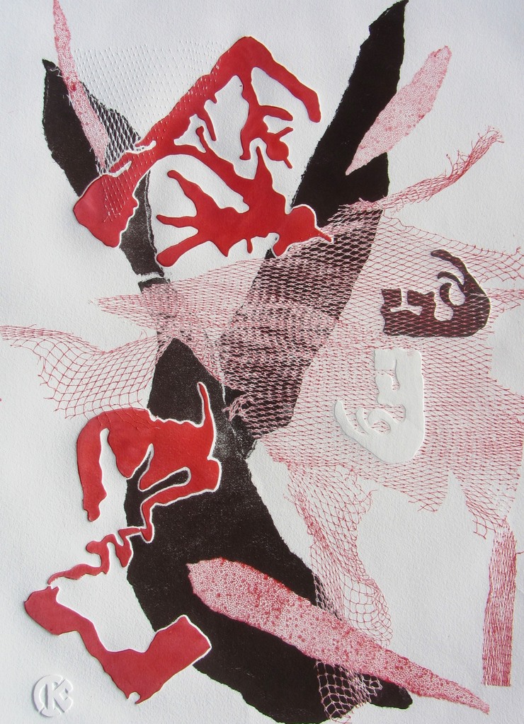 Uitgaande van sterke vormen en mooie structuren ontstaat een spannende compositie, waarin leegte met een verhulde embryo-achtige vorm een belangrijke rol speelt. Geen oplage, maar slechts één afdruk.