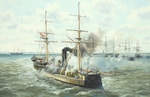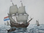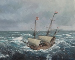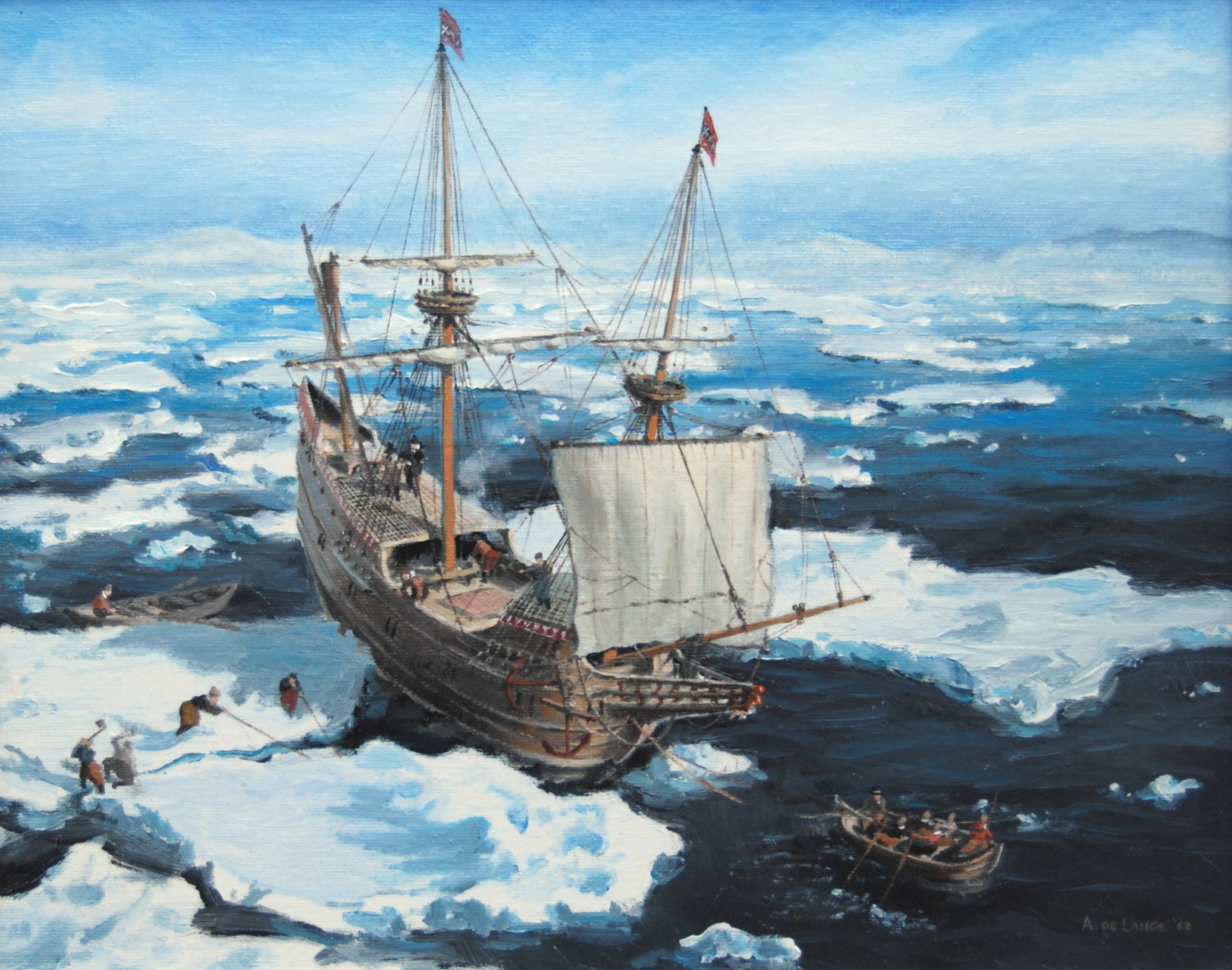 Het schip van Willem Barentsz en Jacob van Heemskerck in het ijs ter hoogte van de Oranje eilanden(Nova Zembla) in augustus 1596. De bemanning is met uiterste krachtinspanning bezig het schip uit het ijs te werken. En altijd het alom aanwezige gevaar om ieder moment door een ijsbeer aangevallen te kunnen worden.