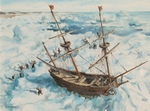 Het schip van Willem Barentsz en Jacob van Heemskerck in het ijs bij de Oranje eilanden(Nova Zembla).