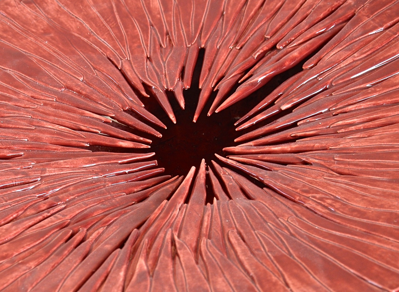 Unieke rode ronde schaal opgebouwd uit puntjes