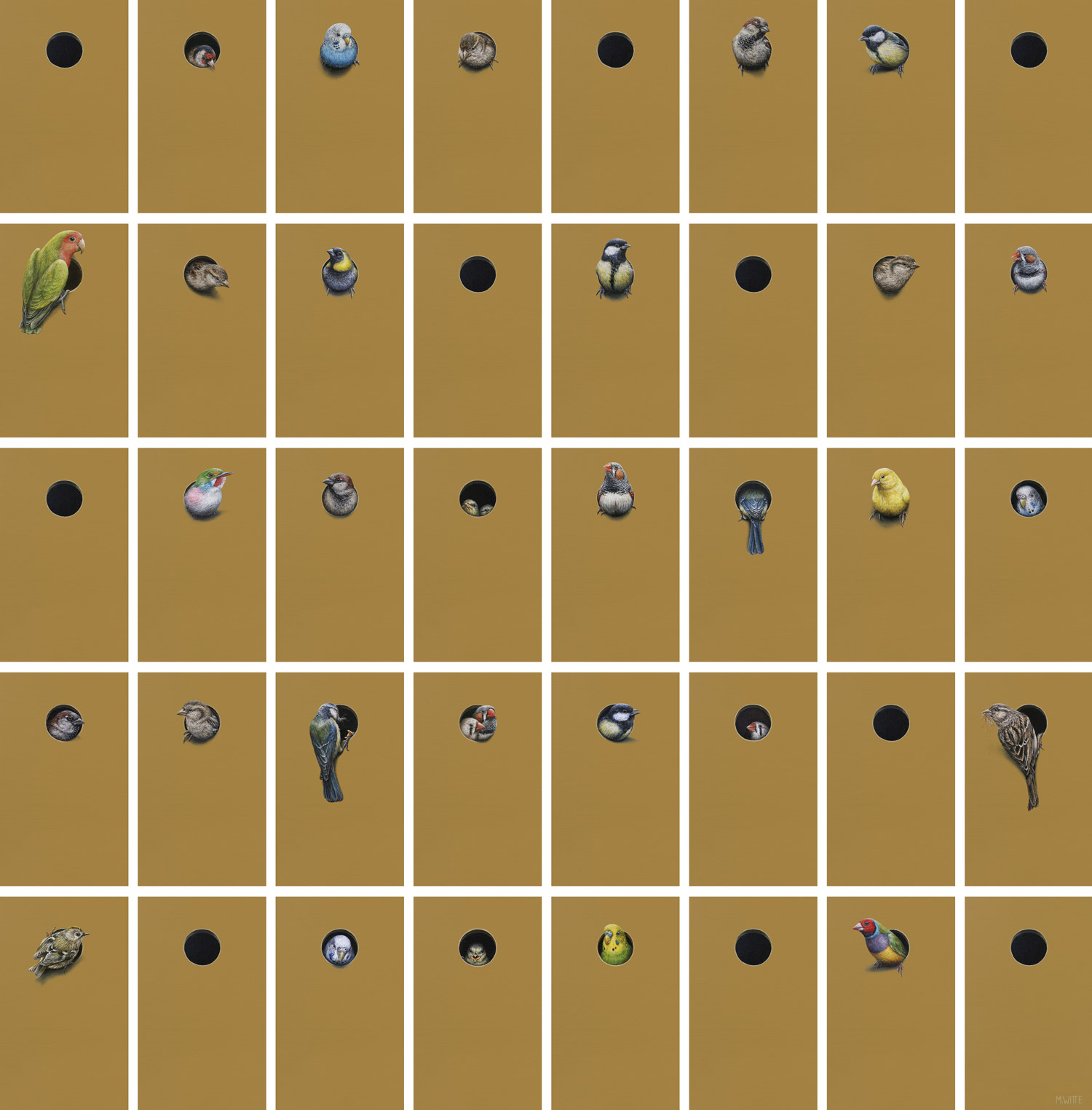 Voor dit werk werd ik geïnspireerd door Utopia, het boek van Thomas More (1516), waarin hij een ideale wereld beschrijft. Ik heb deze wereld verbeeld in een geschilderde installatie, bestaande uit 40 kleine doeken (15x25 cm), die samen een metropool voorstellen. Het werk vormt een ode aan de bewoners van miljoenensteden, waar een multiculturele populatie samenleeft in identieke woonblokken. Een gemeenschap die ik verbeeld heb door bonte vogels, van allerlei kleuren en in allerlei toonaarden. Een ideaalbeeld waarin iedereen in perfecte harmonie samenleeft. Het werk wordt zowel als geheel als afzonderlijk verkocht. Een verkocht 'huisje' wordt vervangen door een nieuw exemplaar en krijgt een nieuwe bewoner.Het hele 'flatgebouw' blijft dus intact, maar de bewoners wisselen. Net zoals gebeurd bij een echt wooncomplex. Meer informatie over het project kun lezen op de informatiepagina. Ontmoet hier alle huidige en oud bewoners van 'Multicultural'