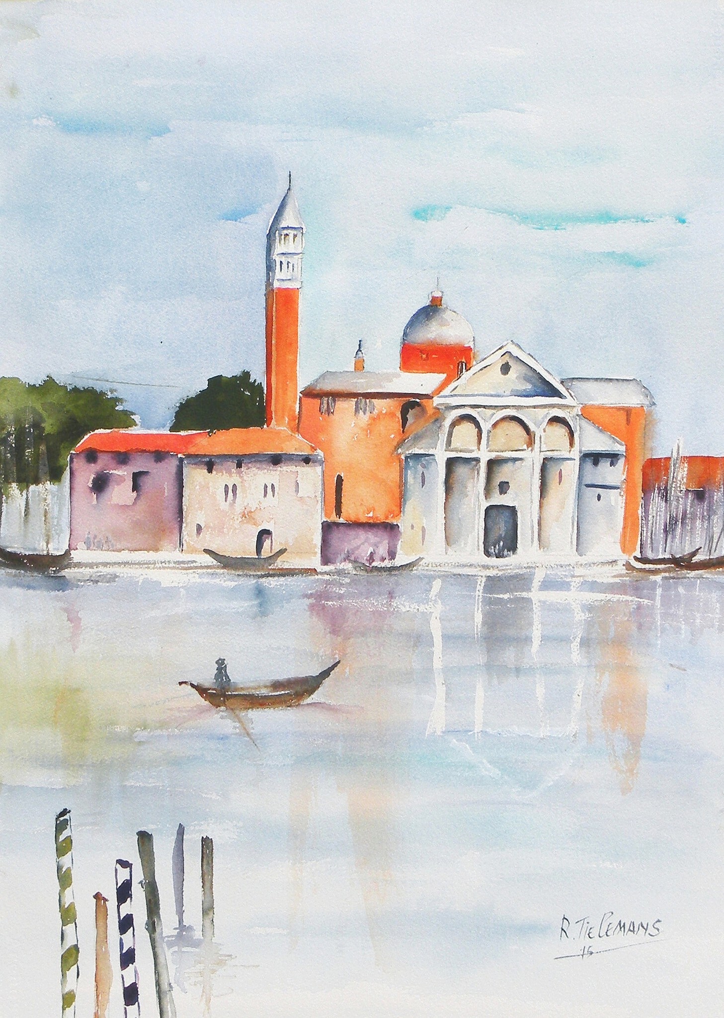 Kunstprinten van dit werk zijn ook verkrijgbaar op canvas, aluminium, plexiglas, posterpapier: https://www.werkaandemuur.nl/nl/shopwerk/Canal-Grande-in-Venetie/1467333 Deze aquarel straalt een dromerige, bijna etherische sfeer uit, waarbij de zachte kleuren en vloeiende penseelstreken een harmonieus geheel vormen. Het tafereel toont een idyllisch Venetiaans landschap, waarin een historische kerk met een karakteristieke koepel en slanke klokkentoren aan de waterkant oprijst. De warme tinten van het gebouw – oker, terracotta en crèmewit – contrasteren subtiel met de koele blauwen en grijstonen van het omringende water en de lucht. De reflectie van de architectuur in het kalme water voegt een gevoel van beweging en mystiek toe, terwijl een eenzame gondel sierlijk door het beeld glijdt. De gondelier is slechts een silhouet, een schaduwachtige figuur die de tijdloze sfeer van Venetië versterkt. De lucht is licht bewolkt, met delicate penseelstreken die de suggestie wekken van een zachte bries. Op de voorgrond steken enkele palen uit het water, wat diepte en perspectief toevoegt. De artistieke stijl, met haar speelse interactie tussen detail en abstractie, laat ruimte voor interpretatie en verbeelding. Het schilderij vangt niet alleen de fysieke schoonheid van Venetië, maar ook de poëtische ziel van de stad.