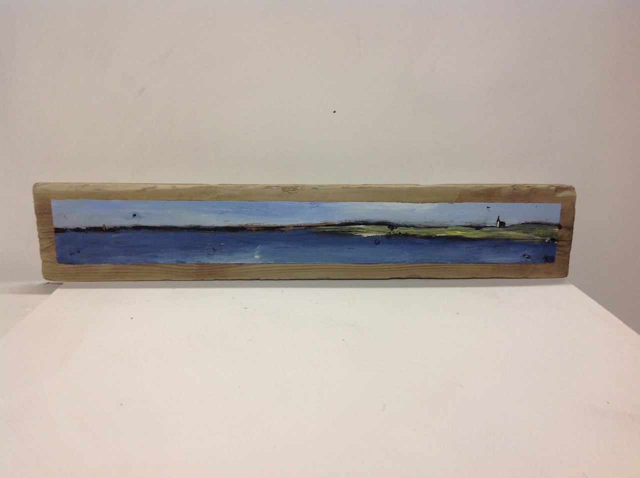 Zeeschildering op hout, met kerkje Den Hoorn (Texel) 15 x 50 x 2 cm.