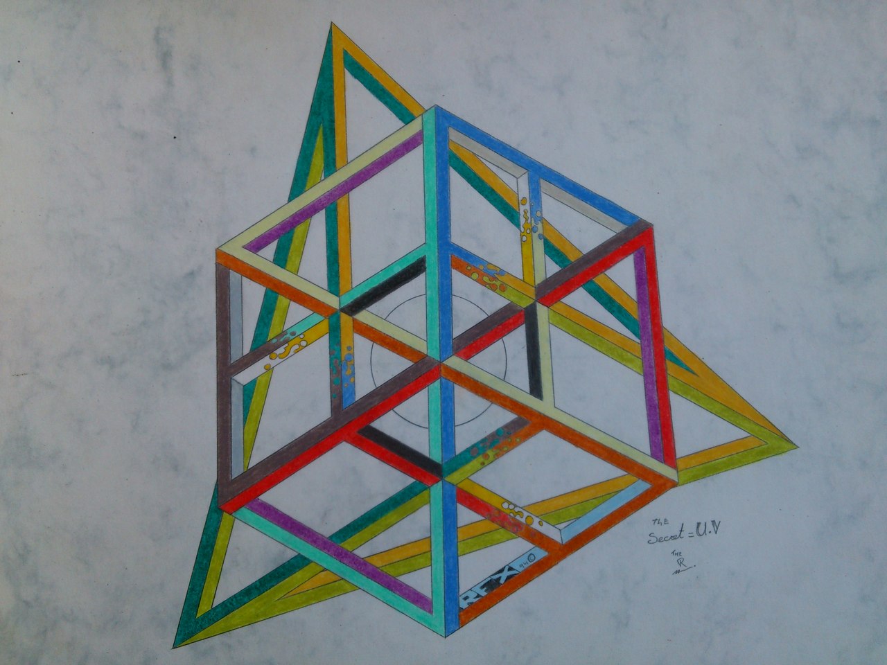 Dit is mijn derde poging om een onmogelijke figuur te maken. De bal in het midden licht op onder uv licht omdat die is bewerkt met een fluoriserende stift.
