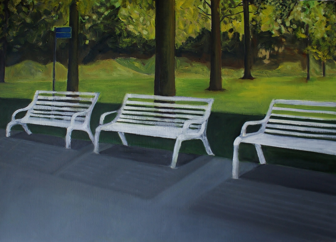 Bankjes in een stadspark, het is hoog zomer. Het park is verlaten en stil. Het heeft iets verstilds. Het straalt rust uit het ritme van de bankjes.