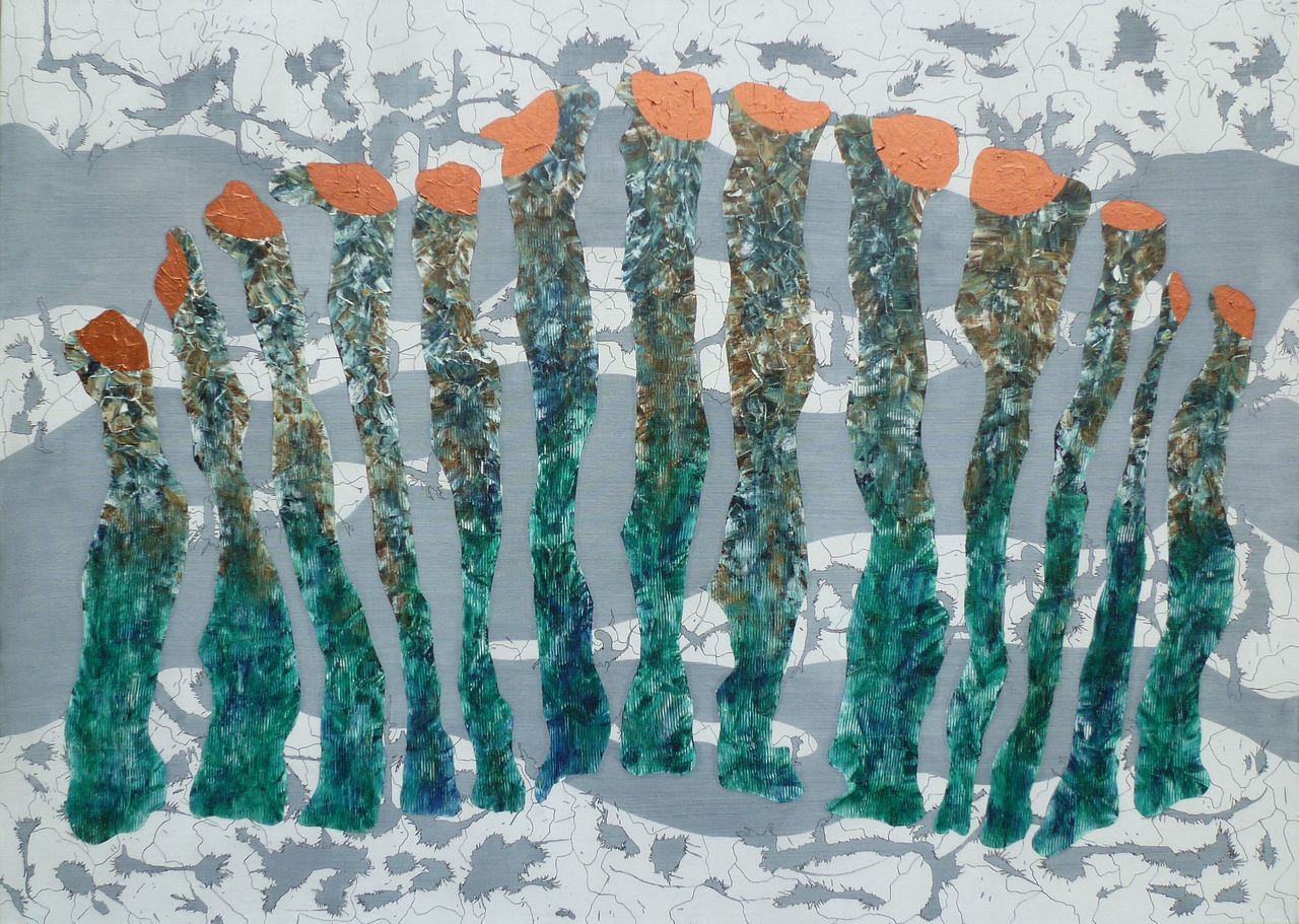 Abstract schilderij uitgevoerd in Olieverf en Inkt op Linnen Ingelijst (stalen baklijst) en gesigneerd