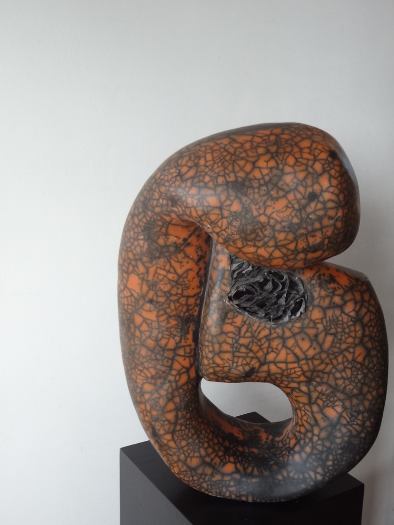 Mijn keramiek is rond, gebogen, zacht en geleidelijk verlopend met verrassende details van laagsgewijs opgebouwde onderdelen die juist speciale aandacht krijgen. Ik laat me uitdagen door het zogenaamde primitieve stoken; pitfire en naked raku.