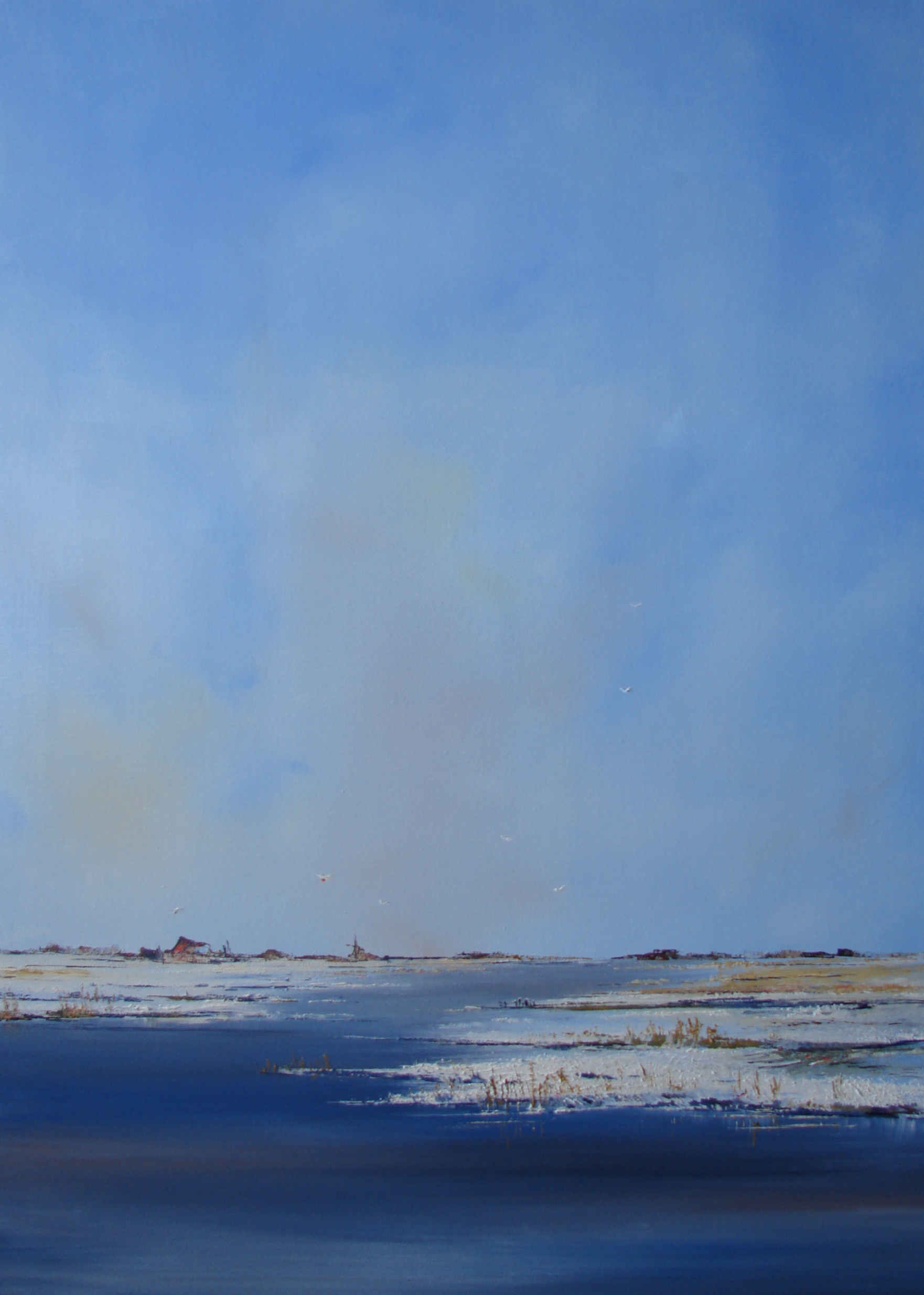 Realistische aquarellen en olieverf schilderijen van Hollands landschap, met altijd expressieve luchten boven de lage horizon zich spiegelend in de waterrijke polder. Ook werken uit de Franse Morvan en van de Oostelijke Algarve in Portugal.