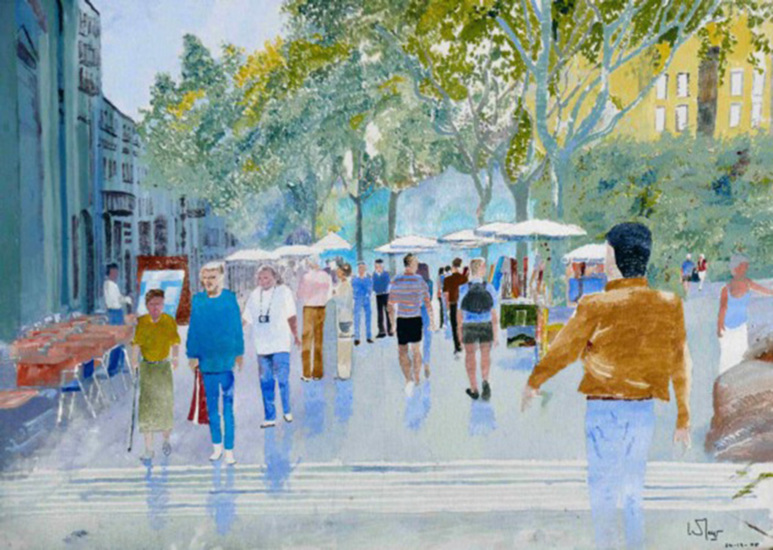 Ik ben autodidact en schilder en teken sinds 1950. Techniek: acryl opdoek, zwart wit tekeningen en aquarellen. Onderwerp: landschappen, stadsgezichten, cafés en terrassen met veel mensen.