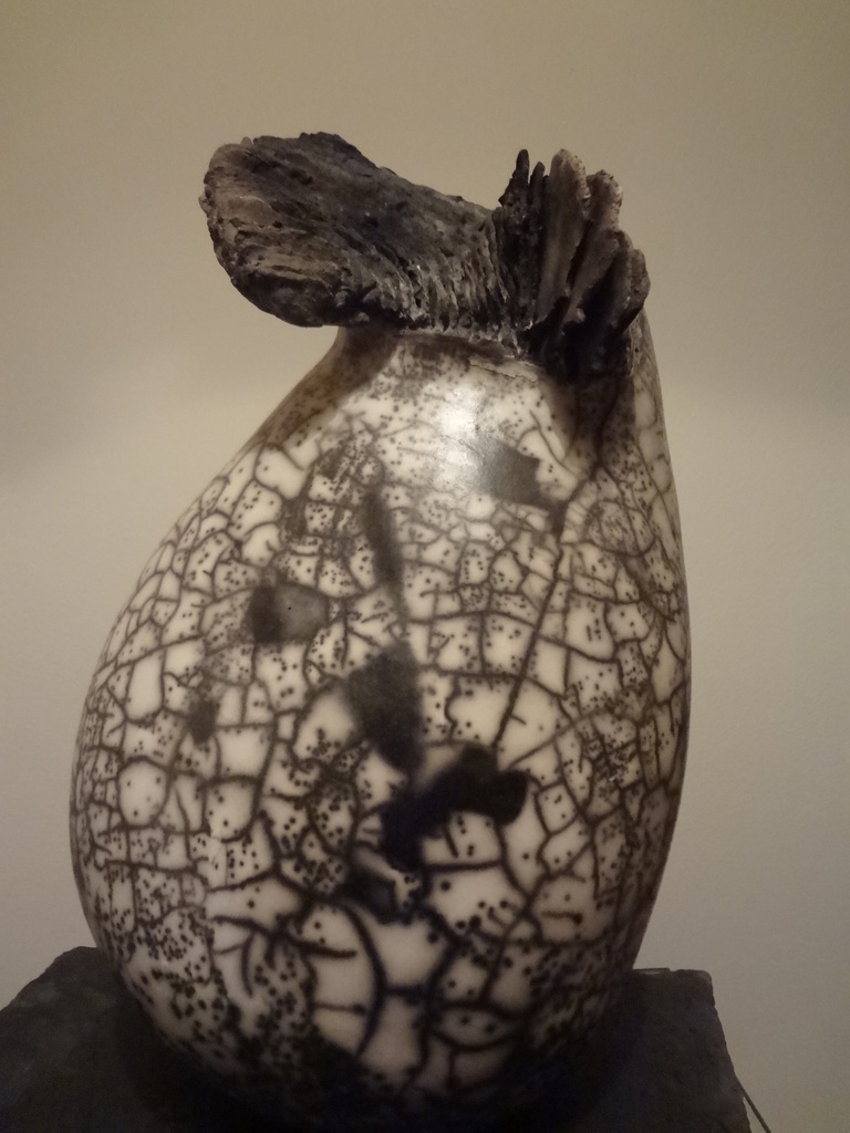 Mijn keramiek is rond, gebogen, zacht en geleidelijk verlopend met verrassende details van laagsgewijs opgebouwde onderdelen die juist speciale aandacht krijgen. Ik laat me uitdagen door het zogenaamde primitieve stoken; pitfire en naked raku.