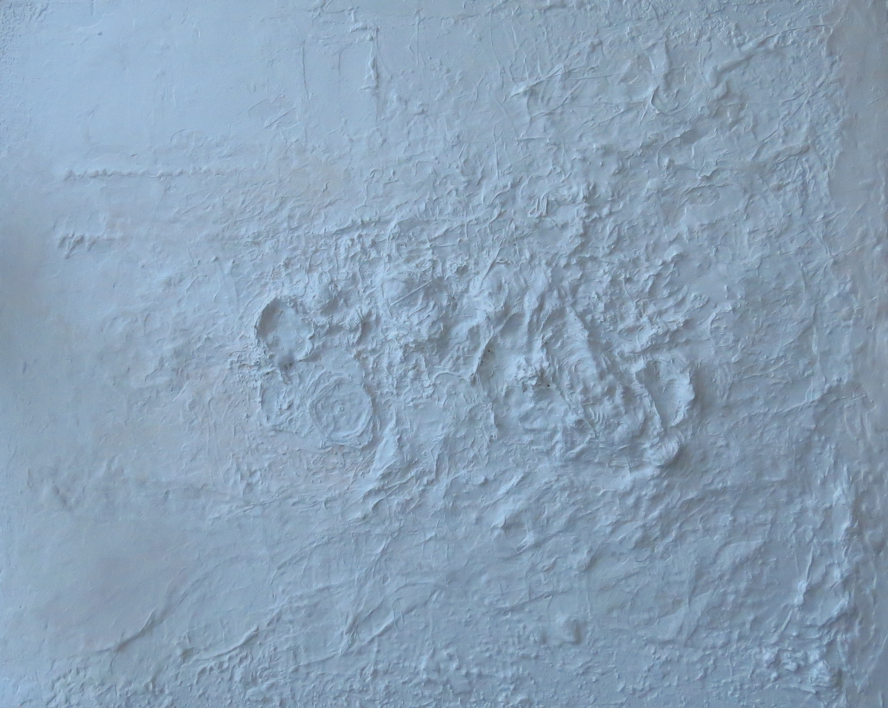 Paneel met afvalmaterialen bedekt met een maagdelijke witte laag verf; ogenschijnlijk ongerept en rein.
