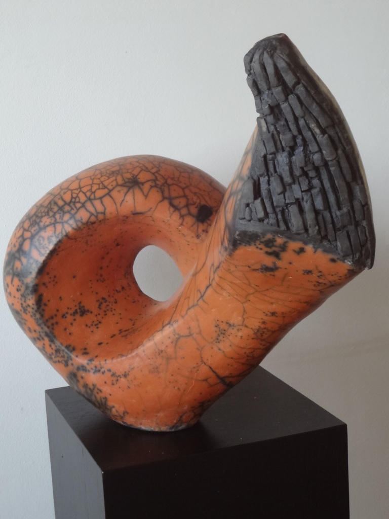 Mijn keramiek is rond, gebogen, zacht en geleidelijk verlopend met verrassende details van laagsgewijs opgebouwde onderdelen die juist speciale aandacht krijgen. Ik laat me uitdagen door het zogenaamde primitieve stoken; pitfire en naked raku.