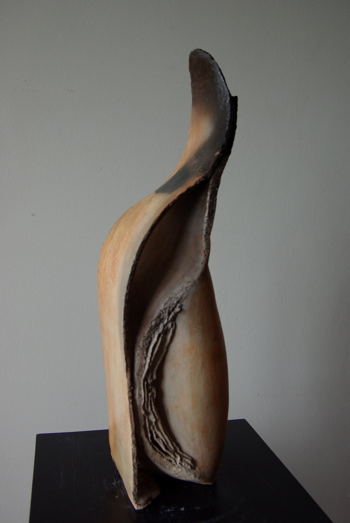 Mijn keramiek is rond, gebogen, zacht en geleidelijk verlopend met verrassende details van laagsgewijs opgebouwde onderdelen die juist speciale aandacht krijgen. Ik laat me uitdagen door het zogenaamde primitieve stoken; pitfire en naked raku.