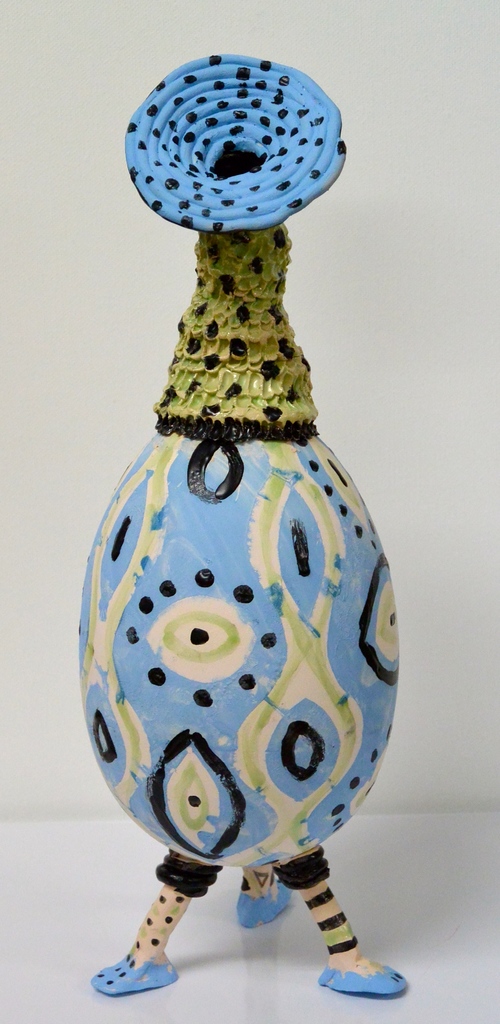 ei met toeter op 3 pootjes, versierd met engobe en glazuur