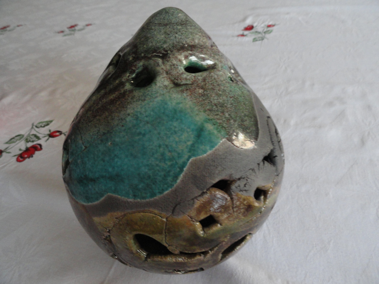 De raku bol met gevlochten delen. De bol heeft mooie craquele effecten door raku stook. Geglazuurd met verschillende glazuren.