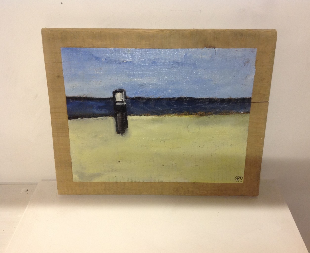 Schildering op hout. Witte strandpaal Texel. 40 x 50 x 4 cm. VERKOCHT.