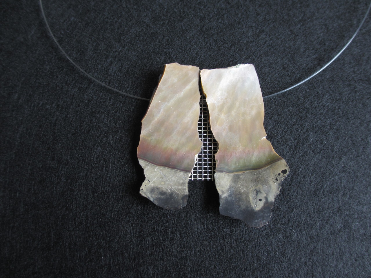 Een klein stukje van een grote schelp is met succes in tweeën gedeeld en vervolgens weer herenigd middels een stukje RVS raster.