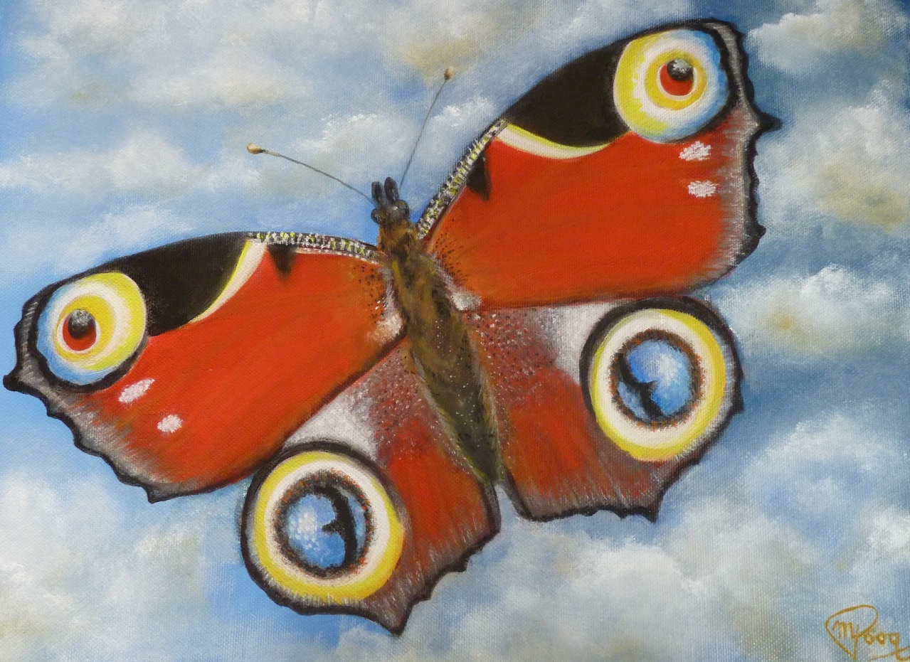 Een rode vlinder tegen een wolkenlucht.