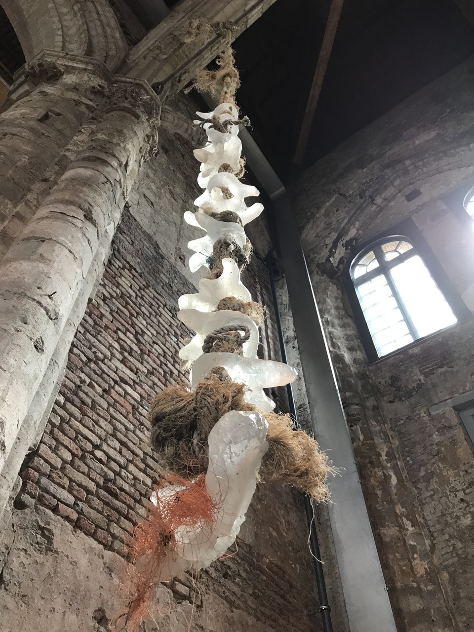 Gegoten glazen wervels en heiligbeen verbonden door een verweerde touw kabel.