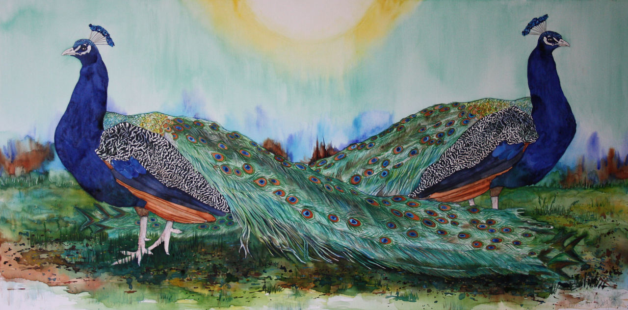 "Mirror me" Gespiegeld dubbelportret van een mannetjes pauw. Aquarel door een speciale techniek op doek geschilderd.