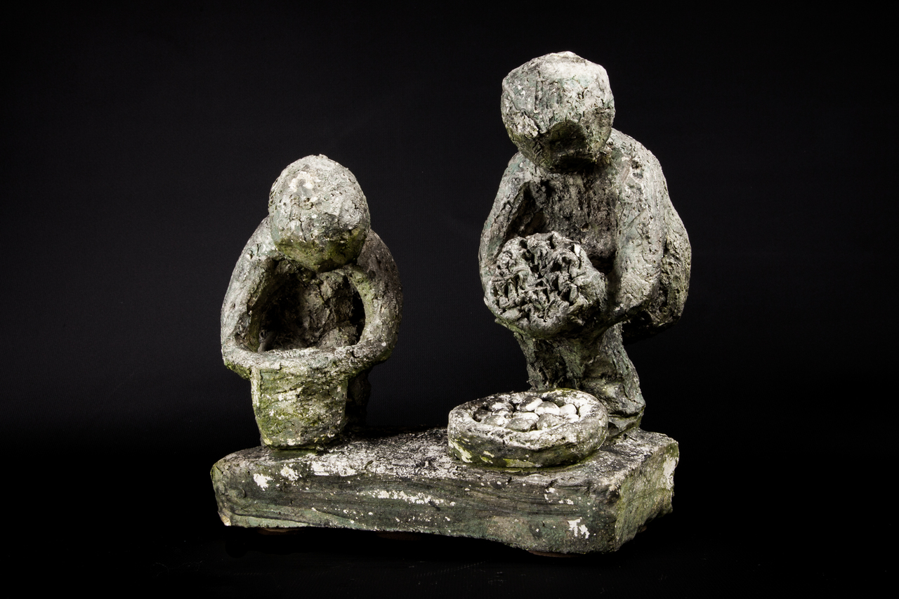 2 Kindertjes die samen op ontdekking zijn. Het ene kindje zit op de knietjes en het andere kindje zakt net door de knietjes. Zij zijn druk bezig en samen ontdekken ze van alles.....! Gemaakt van grove chamotte klei dat na het droogproces van enkele weken is afgebakken op hoge temperatuur (1000 gr) en daarna bronsgekleurd in verschillende lagen. Heeft u vragen.., mail me dan even. Met vriendelijke groet, Aleke
