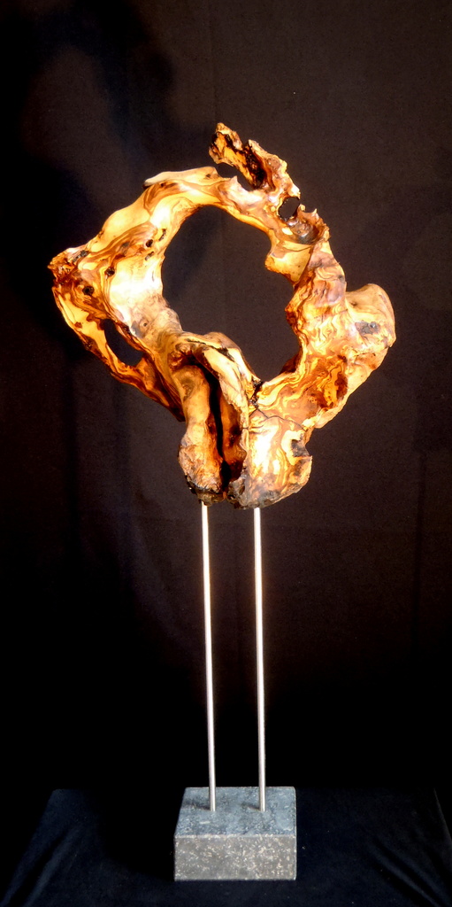 Abstracte sculptuur van het wortelhout van een ruim 200 jaar oude olijfboom, Op RVS-staafjes op een sokkel van Belgisch hardsteen