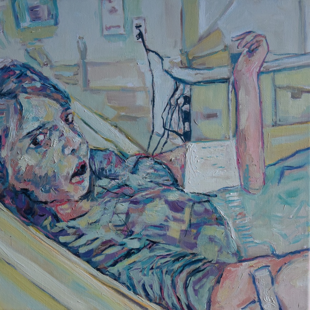 Een kind met een delier na een operatie. Het kind plukt aan de lakens en het infuusslangetje. Het ziet dingen die er niet zijn zoals beestjes.