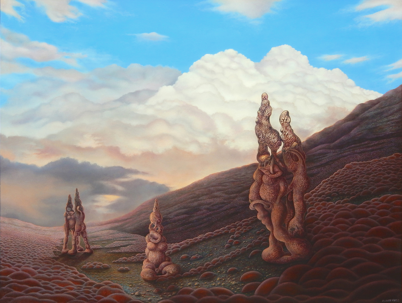 Parende schimmelsculpturen in fantasielandschap (Olieverf)