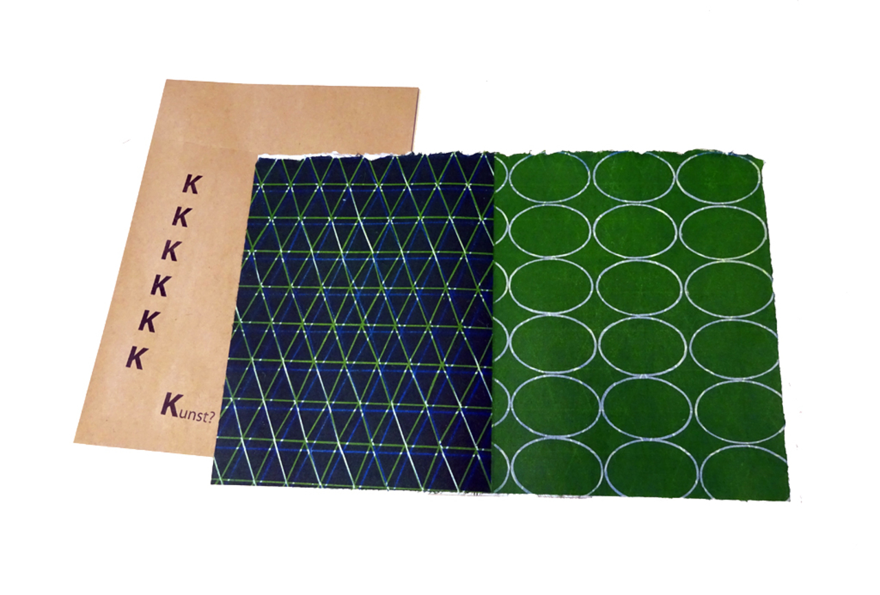 grote K of kleine k. Voor het H.N.Werkmanproject. Met in het midden een blad bedrukt op KOZO, dat een mooi doorschijnend effect geeft aan de achterzijde van het druksel.