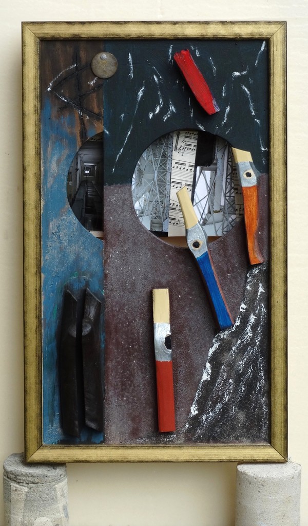 "Als stukken moeten worden bewogen / is het aan te raden / muziek toe te voegen // en mee te delen / dat beweging vaker / in cirkels gaat / dan in een rechte lijn." (Drager Meurtant bezoekt Joseph Cornell) Drie-dimensioneel: de lijst als startpunt 'draagt' de assemblage
