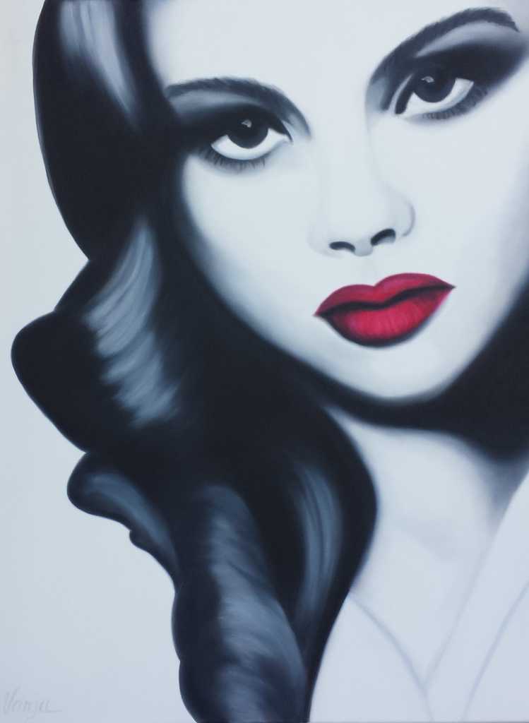 Schilderijen in olieverf. Vrouwelijke schilderijen met een voorkeur van close-up fragmenten, gebracht in een realistische stijl of in een popart stijl.