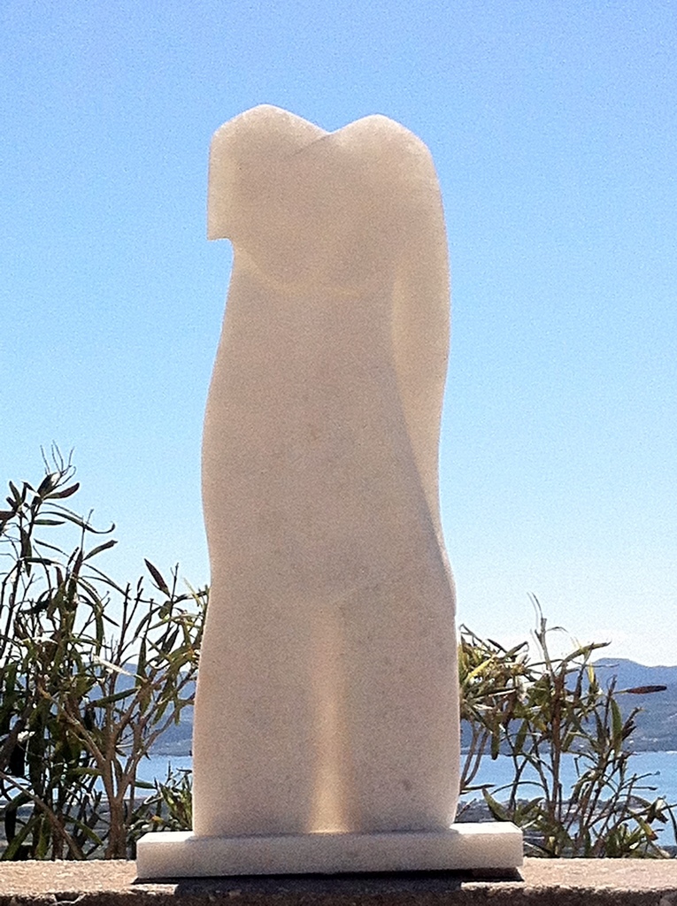 Een vrouwelijke wereld uit steen geboren. Mijn beelden dragen “het eeuwig vrouwelijke” in zich. Zij vertegenwoordigen mijn communicatie met de steen, de lijnen en structuren die zijn ontstaan door de tijden en de steen haar eigen taal geeft. Met name het samengaan van mijn innerlijke taal en die van de steen is één van de boeiende aspecten van het werken met steen: het bevrijden van een nieuwe wereld uit het eens zo vormeloze.