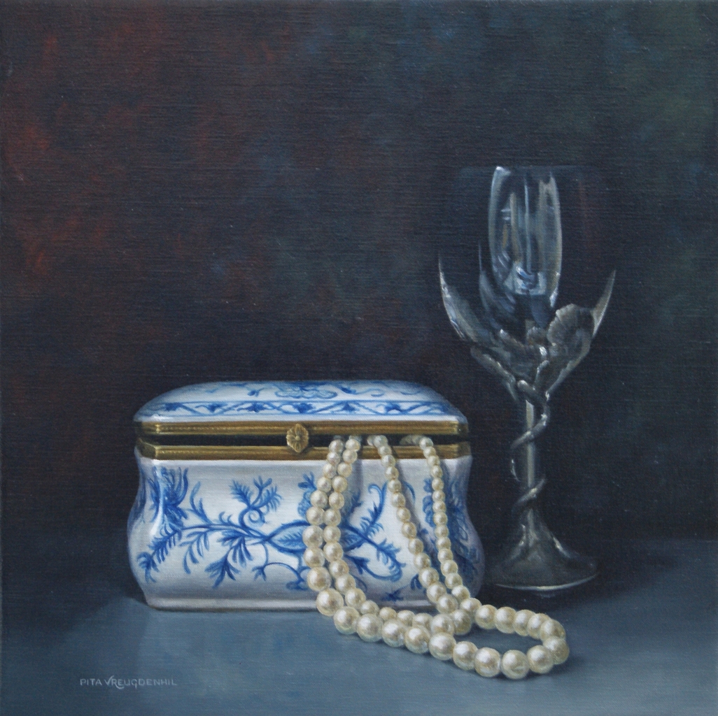 Stilleven met porseleinen bioux doosje, parelketting en glas op zilveren voet. Info: Kunstatelier Pita, Emst