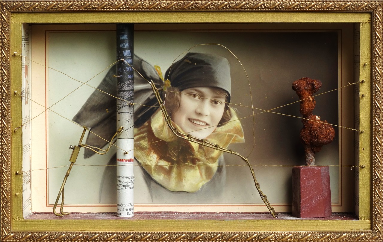 Lange tijd / hing Mrs Offers / met gouden shawl / in een gouden lijst. // De kunstenaar voorzag haar / van meer ruimte en gezelschap / zijnde een beeld IJzeren Pin / met roestig zand / en één met de naam / de Dunne Douwer / plus een paar andere / noodzakelijke attributen. (Drie-dimensioneel, box-assemblage, geïnspiereerd door Joseph Cornell, afmeting 21.5x32x7.5 cm, board, foto, ijzer, zand, acryl-verf, extra oblique afbeelding: http://collagist.org/profile/DragerMeurtant)