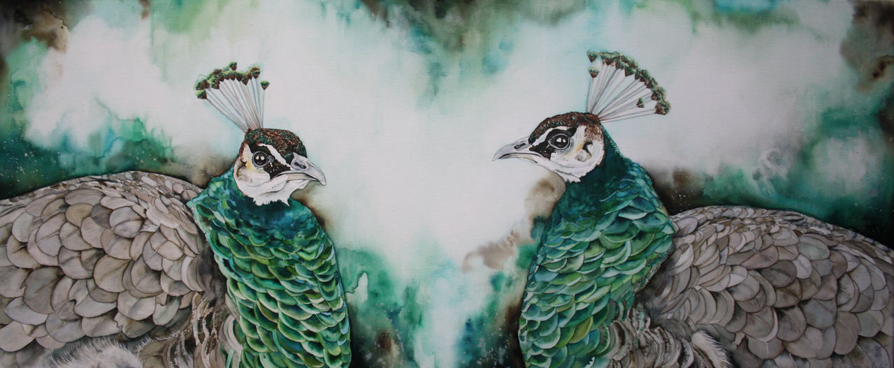 Two times a lady, 2 maal een vrouwtjes pauw, geschilderd tegen een meerkleurige groenige achtergrond met iets zilververf er in. Aquarel door een speciale techniek op doek geschilderd.