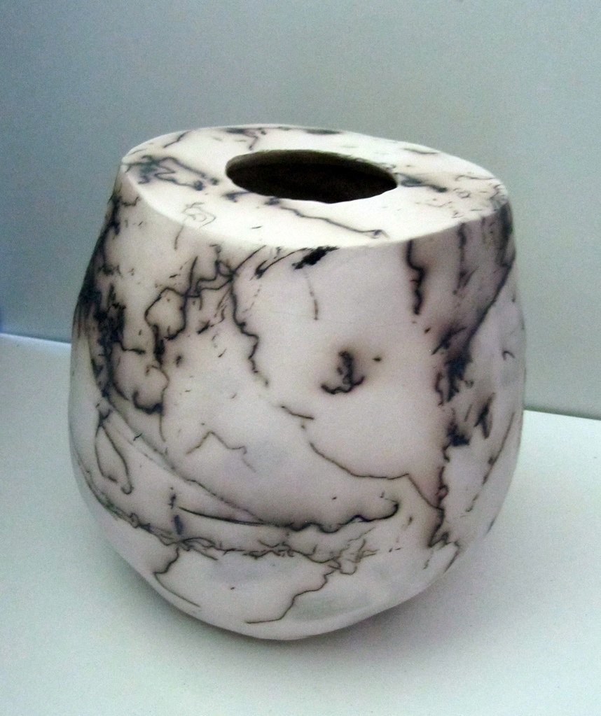 Bolvaas (kan door de stooktechniek niet als zodanig gebruikt worden), met platte bovenkant. Na de 2e stook is de vaas met paardenhaar bewerkt, wat een bijzonder effect geeft.