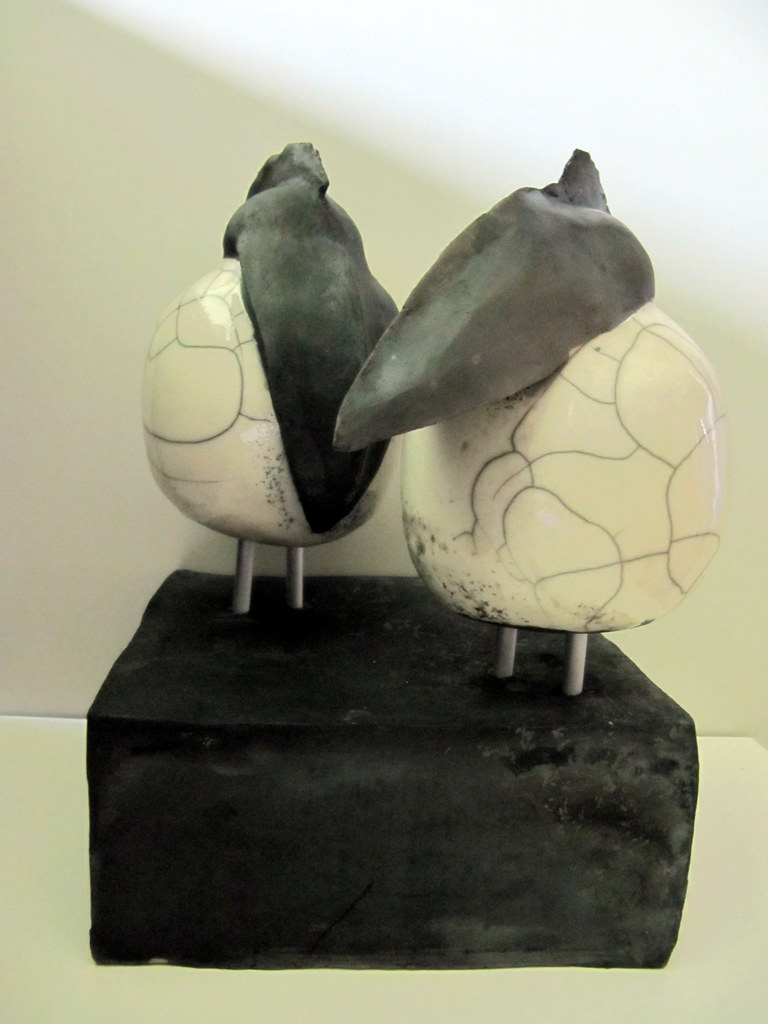 2 vreemde vogels in de Raku techniek. Door de transparantglazuur is het wit mooi gecraqueleerd. De vogels zitten samen op een zwart keramiek plateau. 1 vogel heeft de snavel spits naar voren de ander naar beneden.