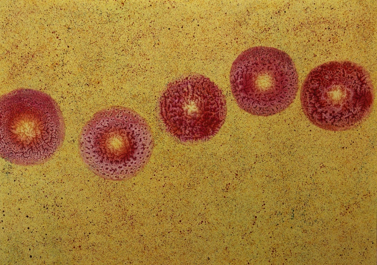 Dit schilderij hoort naast ritme 2. De cirkels hebben structuur. Het schilderij is 50 x 70 cm, samen 50 x 140 cm. Ze worden samen voor € 400 verkocht. De cirkels hebben structuur. De achtergrond van het schilderij is wat citroengeler van kleur. Er zitten blauwgroene spikkels in de achtergrond wat niet goed zichtbaar is.