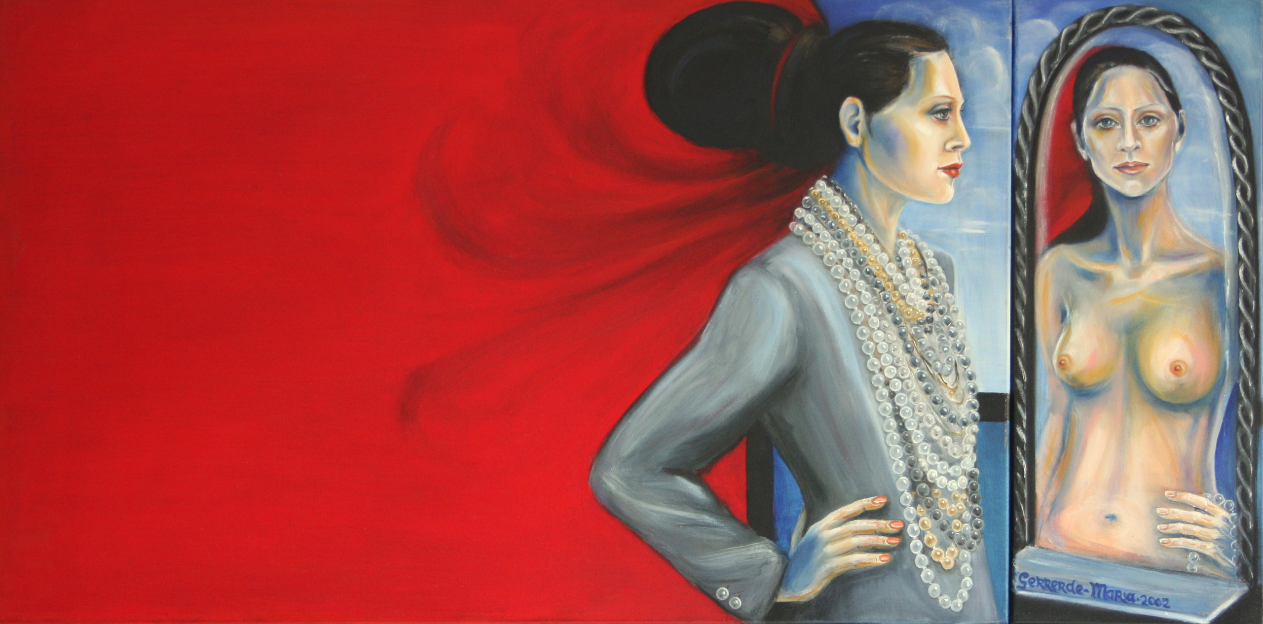 Tweeluikje in een lijst.Het toont de 'buitenkant' zoals iedereen die ziet maar als ze in de spiegel kijkt ziet ze zichzelf zoals ze werkelijk is zonder opsmuk.