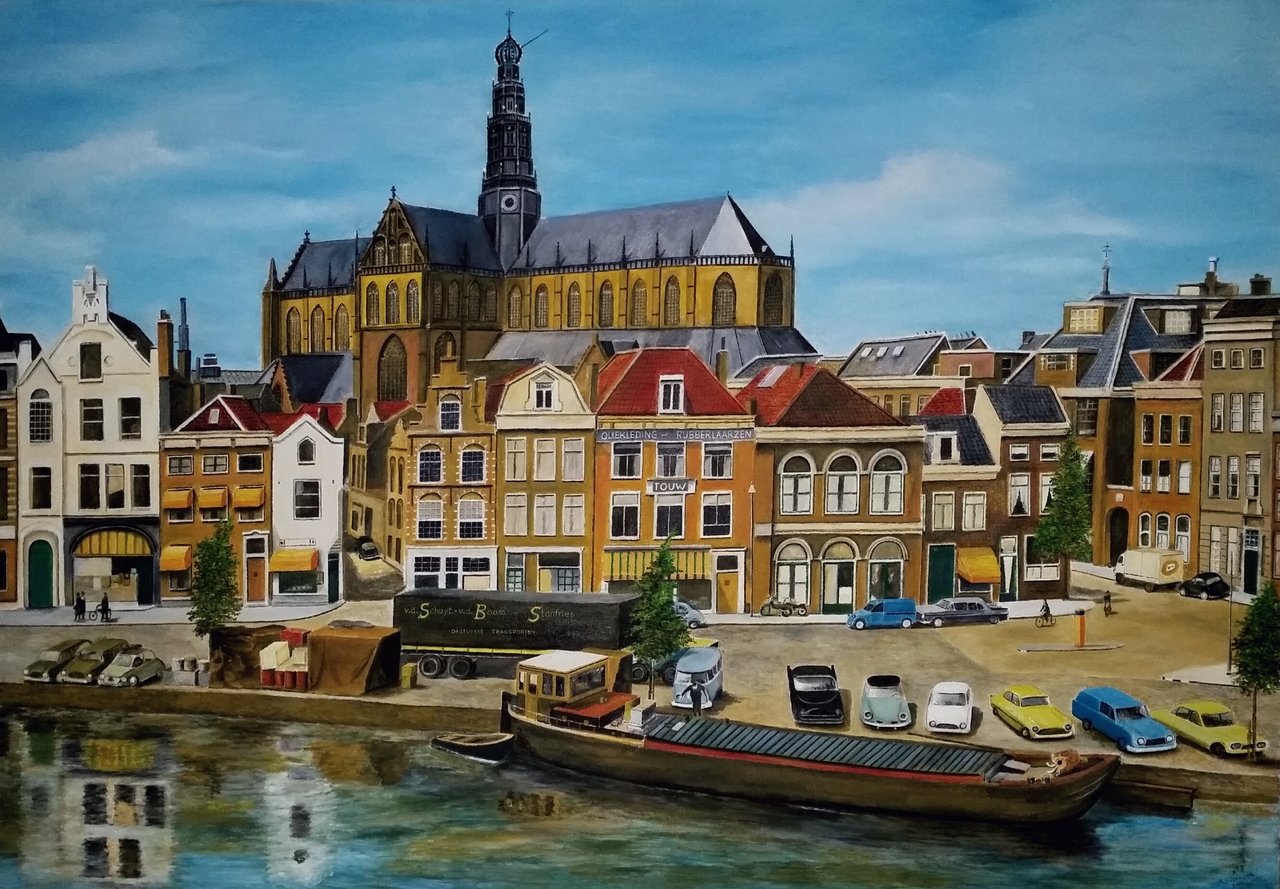 Stadsgezicht Haarlem begin jaren 60 met op de achtergrond de st. Bavokerk.
