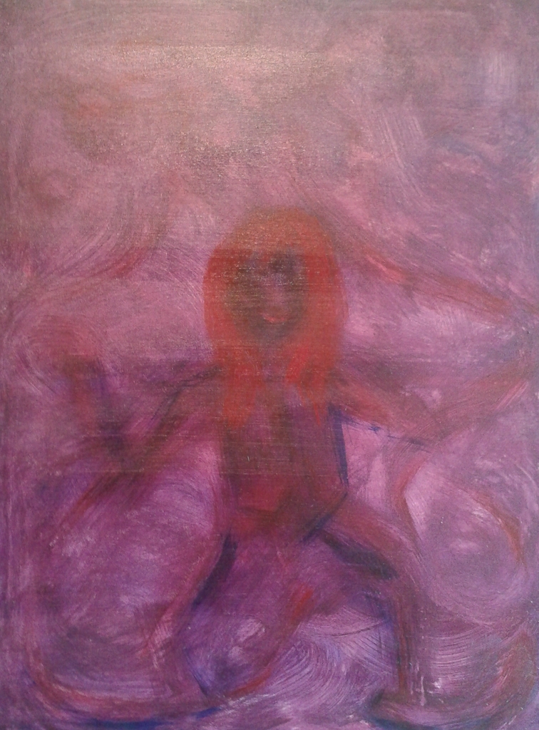 Ik schilder intuitief en krachtig met de kleur paars en zie er een meisje met een springtouw in ontstaan.