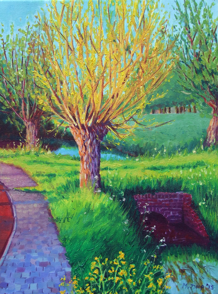 Geïnspireerd door Vincent van Gogh. Niet alleen door het onderwerp; knotwilgen, maar ook door het complementaire kleurgebruik. Geel tegenover paars, groen en rood, blauw en oranje... De kleuren zijn enorm helder en fris gebleven.